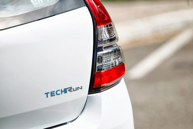 Por fora, traz rodas aro 15'' cinzas (as mesmas da antiga série Vibe), capas dos retrovisores e maçanetas também na cor cinza, adesivos Tech Run nas portas dianteiras e tampa do porta-malas, além de adesivo preto na coluna B.
